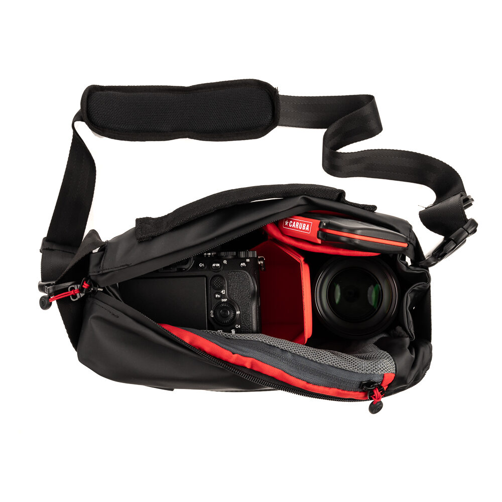 Het hoofdcompartiment van de Caruba Compex Chase 100 is uitgerust met uitneembare origami dividers. Dit unieke ontwerp zorgt ervoor dat je de binnenruimte van de tas naar wens kunt indelen, waardoor je nog meer spullen mee kunt nemen. Of je nu extra lenzen, een flitser of andere accessoires wilt meenemen, deze dividers maken het mogelijk om alles veilig en georganiseerd op te bergen.