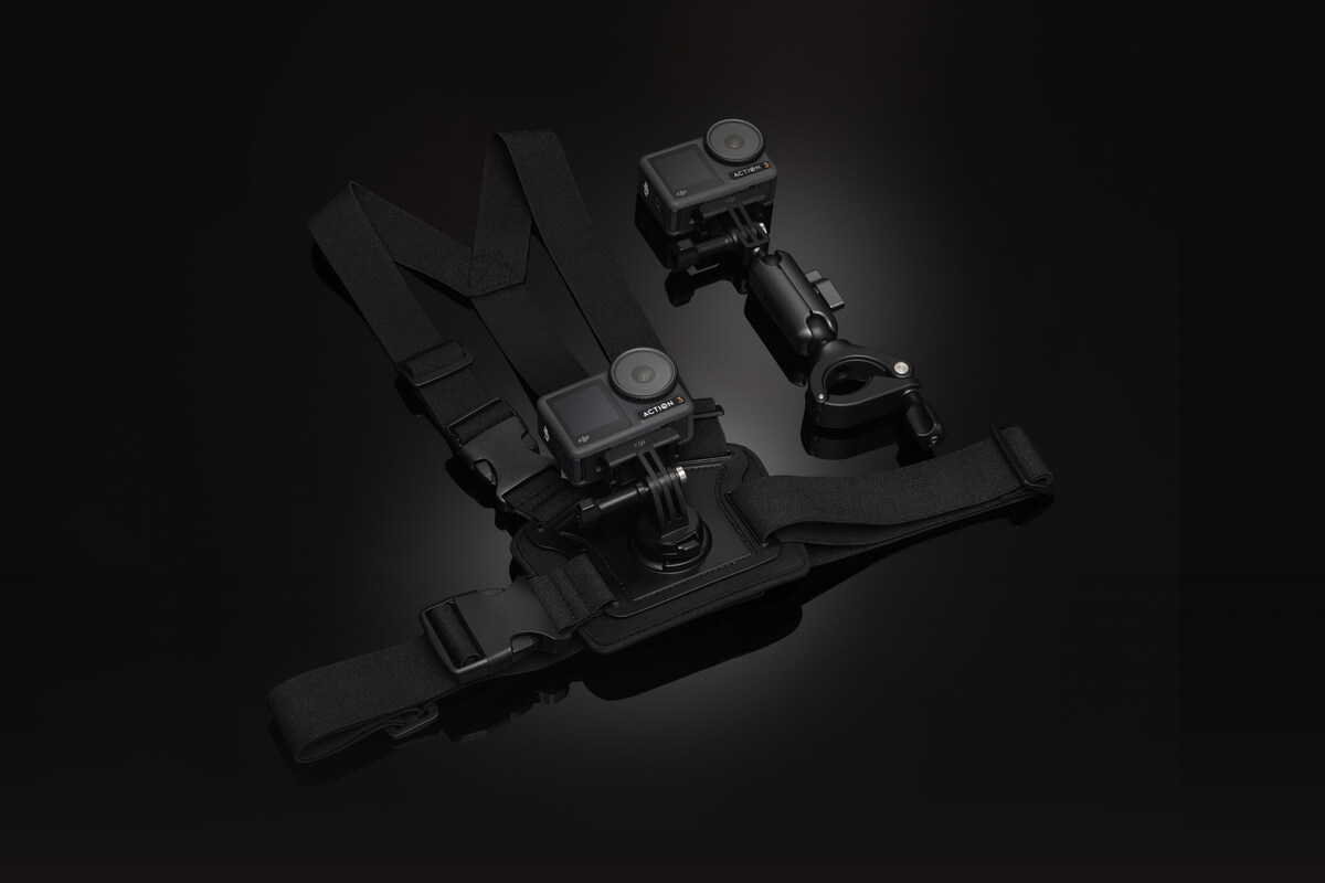 Bevat de Osmo Action-borstriembevestiging en Osmo Action-stuurbevestiging om uw camera aan uw borst of stuur te bevestigen, zodat u zich kunt concentreren op uw rit en in het moment kunt blijven.