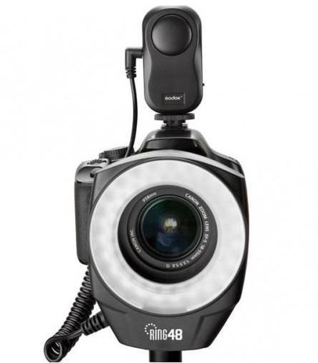 De Godox Ring48 ringverlichting 5500K is geschikt voor macrofotografie en/of video. De continue ringverlichting wordt door middel van een adapterring op de foto- of videocamera geplaatst.De verlichting is rond de lens aangebracht en geeft daardoor een prachtig zacht en schaduwloos licht. Voor de heldere lichtbron zijn 48 LEDS met een zeer laag stroomverbruik gebruikt. De ringverlichting wordt gevoed door middel van 2 penlight batterijen van 1.5 volt of een 3 volt adapter. Op 2 Ni-HM batterijen werkt de verlichting 1.5 uur. De verlichting is instelbaar op halve of volledige lichtopbrengst. De Godox Ring48 wordt compleet geleverd met 6 verloopringen van 49, 52, 55, 58, 62 en 67mm en een netadapter.