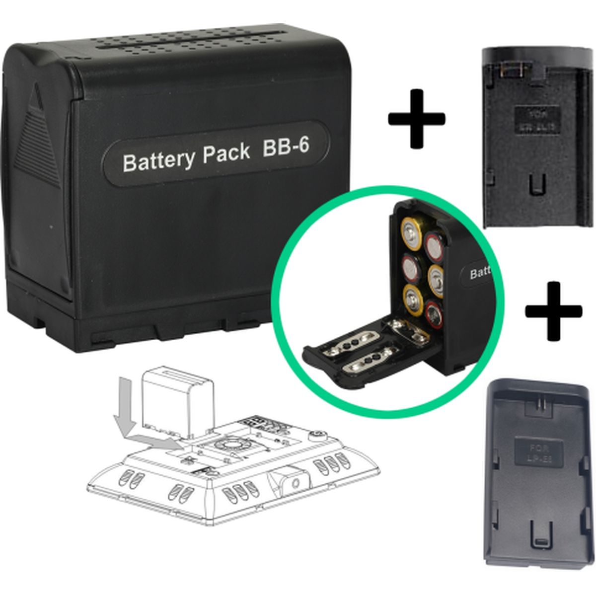 De McoPlus Adapter set bestaat uit een 6x AA Penlite batterijhouder en accuplaatjes voor de Canon LP-E6 en de Nikon EN-EL15 accu’s. Deze voeding kan worden gebruikt in combinatie met de McoPlus LED lampen en biedt lange stroomvoorziening.