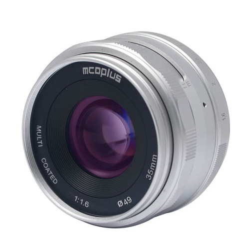 Mcoplus Mco-35mm-f/1.6. Component voor: Compactcamera, Lensstructuur (elementen/groepen): 7/6, Dichtstbijzijnde focus afstand: 0,3 m. Compatibele camera merken: Fujifilm, Maximum vergroting: 0,113x, Kenmerken lenscoating: Nano-coatingsysteem (NCS). Kleur van het product: Zilver. Diameter: 4,9 cm, Maat filter: 4,9 cm, Gewicht: 206 g