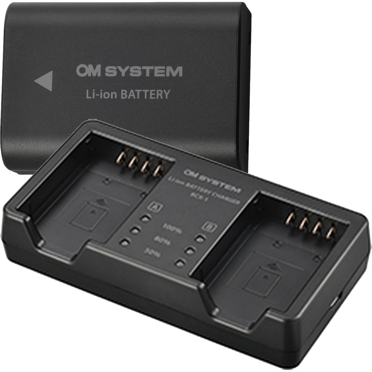 Originele dubbellader voor de OM System BLX-1 accu + extra accu