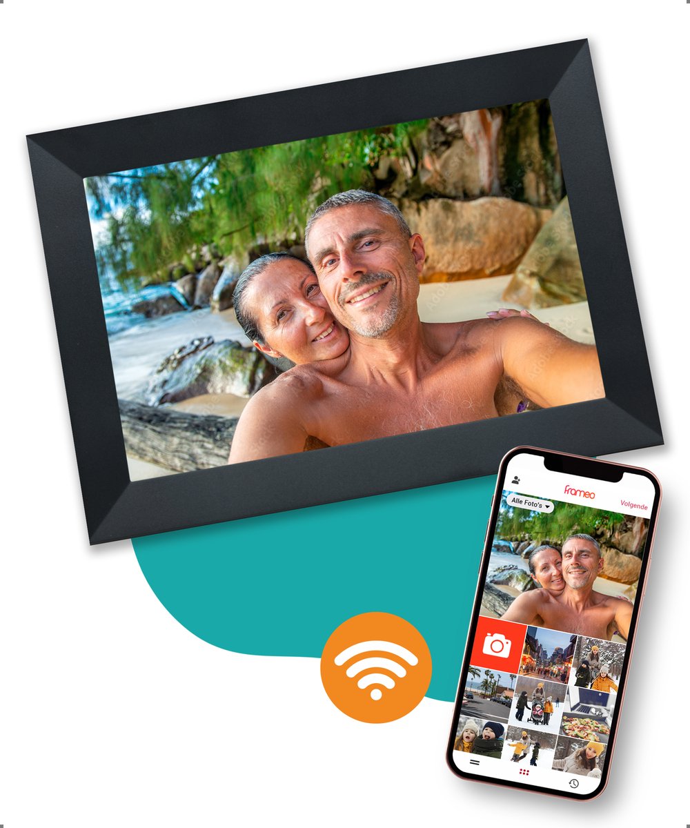 Frameo is een app op je mobiele apparaat (Android / iOS). Met deze app kan je via WiFi overal verbinding maken met jouw digitale fotolijst. Er kunnen meerdere mobiele apparaten aan de fotolijst gekoppeld worden. Zo kan bijvoorbeeld een hele familie of vriendengroep foto’s sturen naar een enkele fotolijst. Een leuke en interactieve manier dus om foto’s te delen zonder! Foto’s worden enkel verstuurd via de app en niet opgeslagen door Frameo. Hierdoor zullen jouw persoonlijke foto’s niet zonder toestemming door derden inzichtelijk zijn.