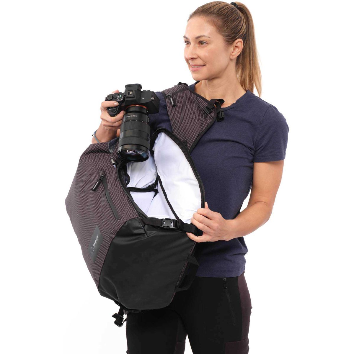 Deze rugzak is uitgerust met de speciaal voor vrouwen ontworpen Capture Straps van Shimoda. De pasvorm sluit goed aan op het vrouwelijk lichaam en biedt ondersteuning zonder in te leveren op comfort. De schouderbanden zijn compatibel met cameraclips van alle merken en hebben zachte padding achter de bevestiging. In de band zit een ritsvak dat groot genoeg is voor een iPhone Max en een uitrekbaar zijvak voor accessoires of een drinkfles. Via een verborgen doorgang leid je eenvoudig een portofoonkabel of waterslang langs de band.