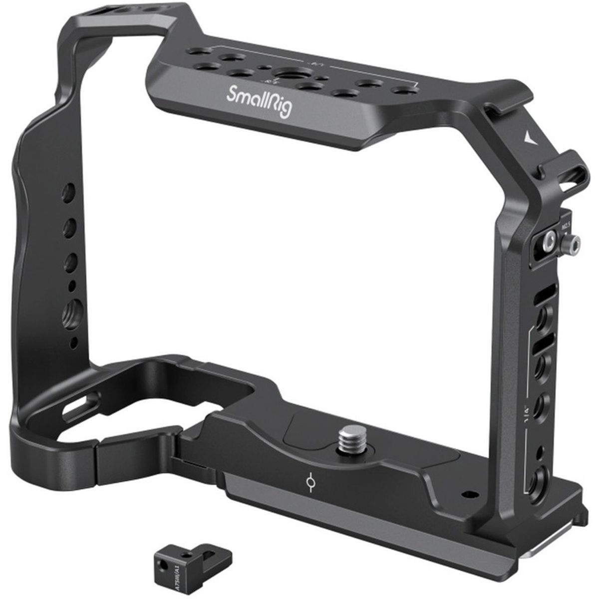 De SmallRig Full Cage voor Sony A 7 IV,A7R V, ,A 7S III ,Alpha 1 is ontworpen voor het bevestigen van accessoires en het beschermen van de camera. Aan de onderkant zit een 1/4″-20 schroef om de camera vast te zetten en doorbuigen te voorkomen. Ingebouwde beschermende afstandhouders rondom voorkomen dat de camera bekrast wordt. De cage geeft toegang tot interfaces, draaiknoppen, knoppen of batterijklep. Er is een spindelsleutel bij het batterijcompartiment die past bij de curve van de camera en ruimte laat voor de pink voor een comfortabele grip. 1/4″-20 schroefdraadgaten, ARRI 3/8″-16 positioneergaten, en koude schoenen ondersteunen diverse accessoires. Aan de onderzijde bevindt zich een Arca snelkoppelingsplaat. Gaten aan de zijkanten en de onderkant van de kooi maken het mogelijk accessoires zoals een handriem en een schouderriem te bevestigen. Bovendien wordt de cage geleverd met een ingebouwde magnetische sleutel die demontage en montage vergemakkelijkt.