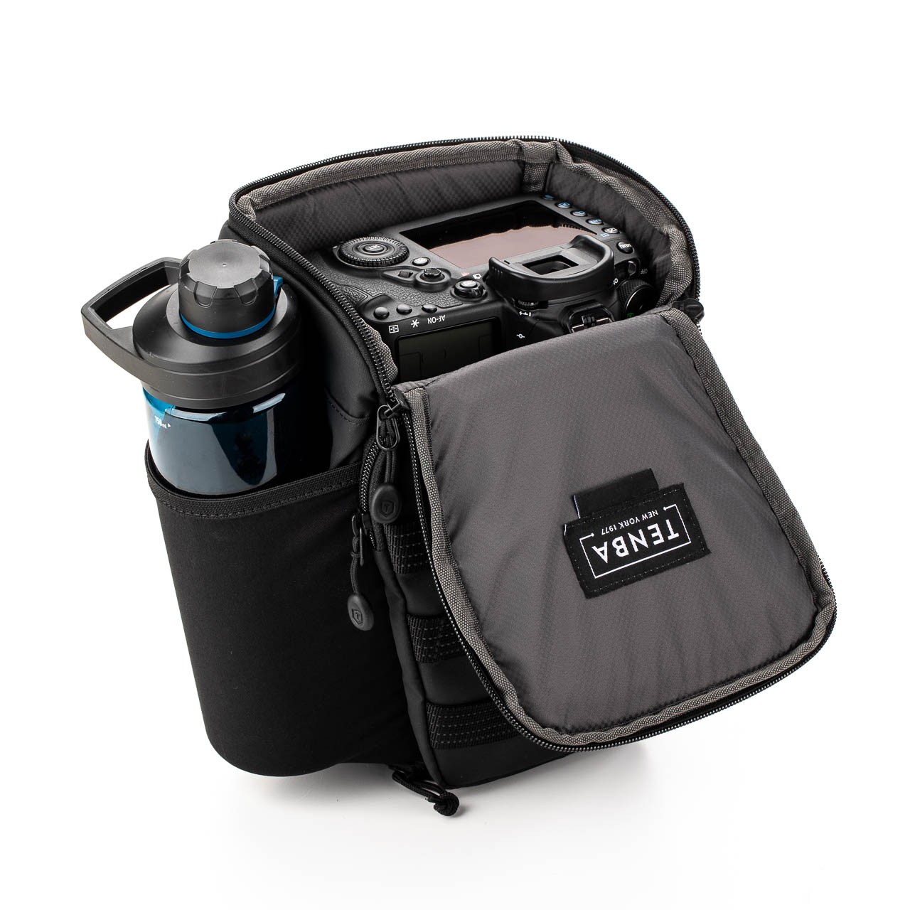 In deze tas past een Mirrorless of DSLR camera met 24-70mm f/2.8 lens en via de rits aan de onderkant, groter te maken zodat ook een 70-200 f/2.8 of 24-70 f/2.8 met zonnekap past.