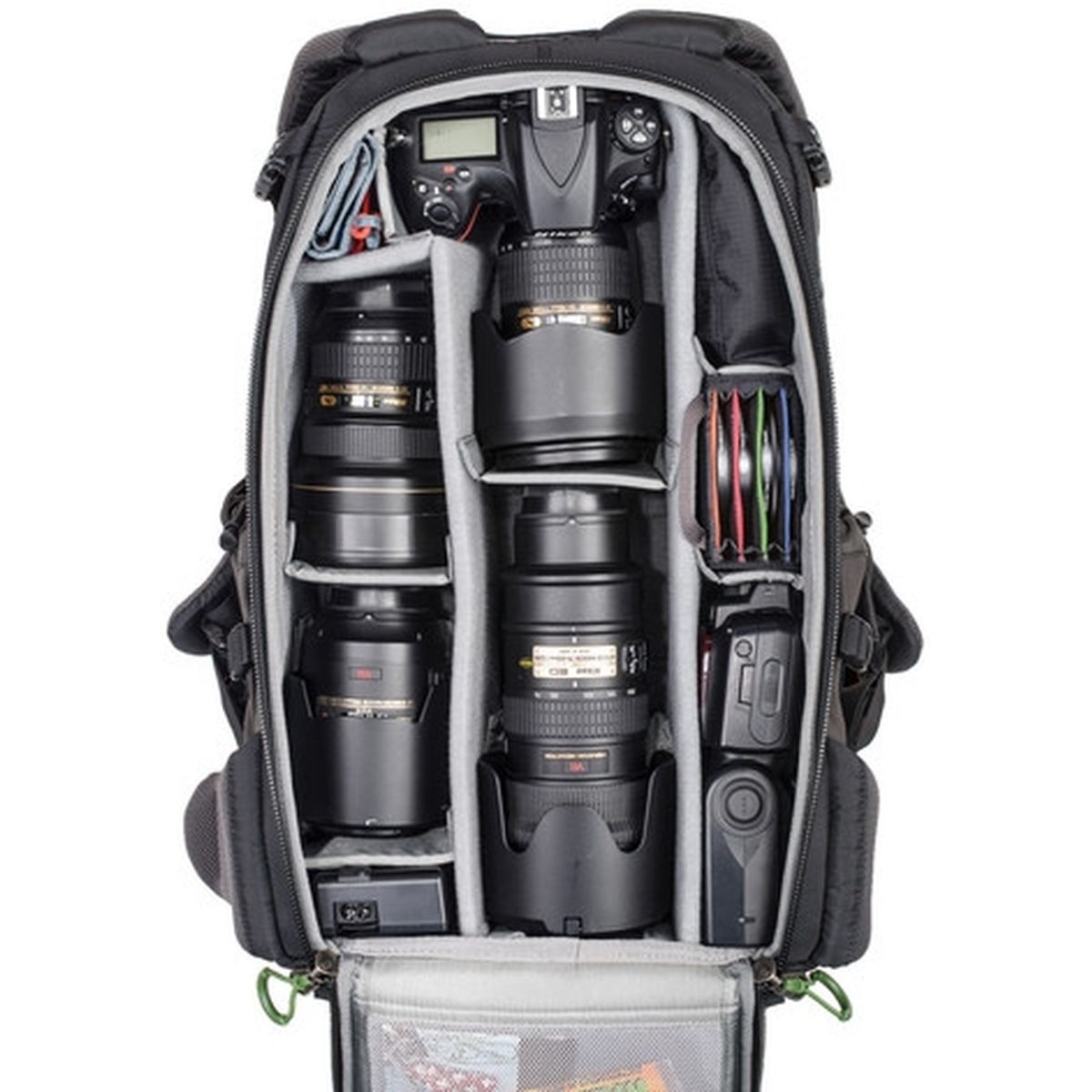 Het camera-compartiment biedt plaats aan een standaard spiegelreflexcamera met vier tot zes standaard zoomobjectieven plus een reportageflitser of twee grote systeemcamera’s met vijf tot zeven objectieven en een reportageflitser. In het voorste compartiment met een inhoud van negen liter kunt u uw persoonlijke spullen opbergen. Daarnaast is het mogelijk om een objectief ter grootte van een 200-400mm f/4.0 los van de body mee te nemen. In het voorste compartiment bevindt zich ook een gevoerde sleeve voor een 15 inch laptop en een 10 inch tablet. Aan beide zijden van de rugtas bevindt zich een elastisch vak voor bijvoorbeeld een fles water, handschoenen of een muts. Vakken op de voorzijde kunt u gebruiken voor het opbergen van kleine accessoires zoals accu’s, lader of een zaklamp. Lussen op de tas maken het mogelijk om uw statief of monopod veilig mee te nemen.