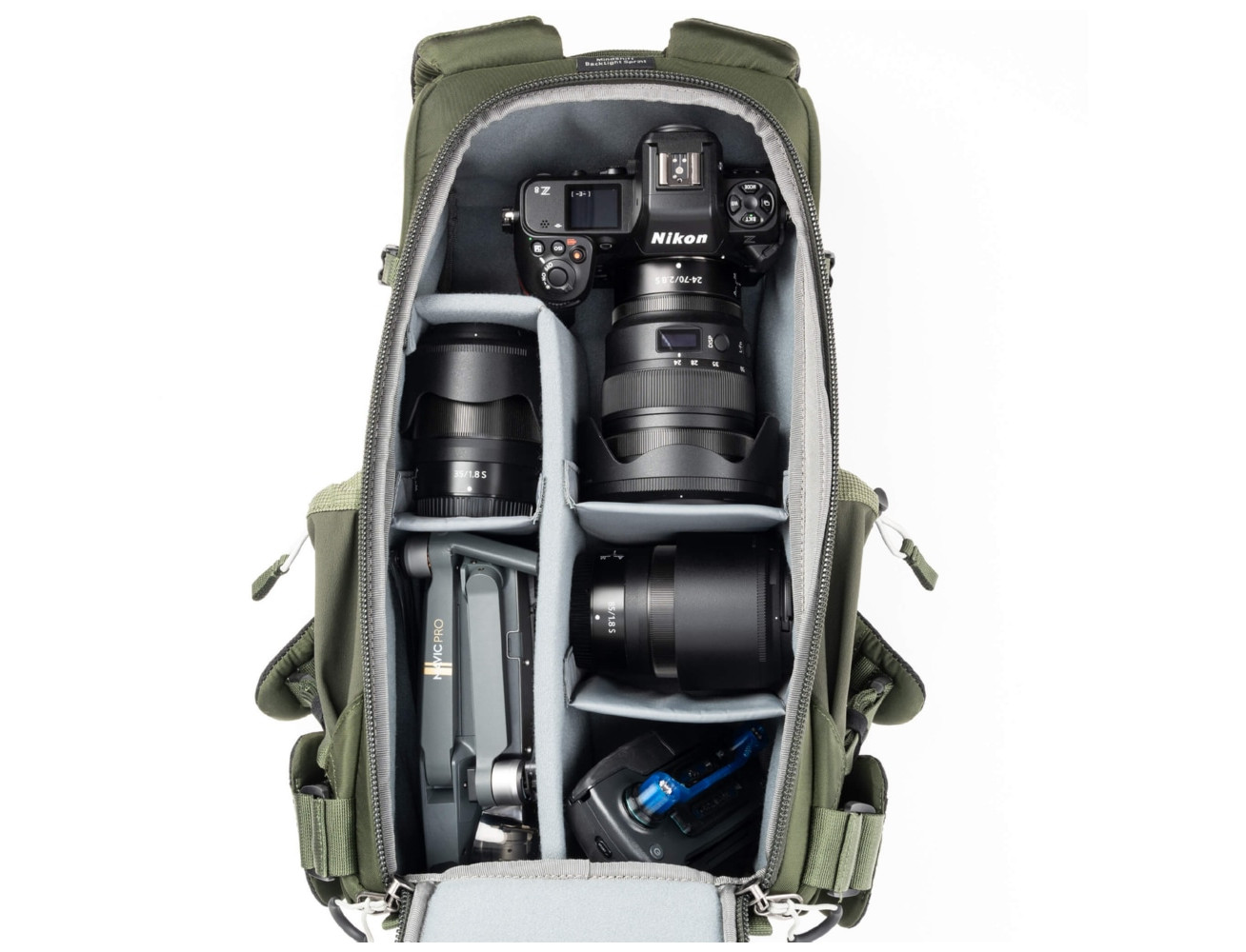 De rugzak biedt voldoende ruimte voor een standaard camerabody en drie primaire zoomlenzen. De verstelbare klittenbandinterieurverdelers maken het organiseren van grote telelenzen, traditionele fotogear of persoonlijke items een fluitje van een cent.